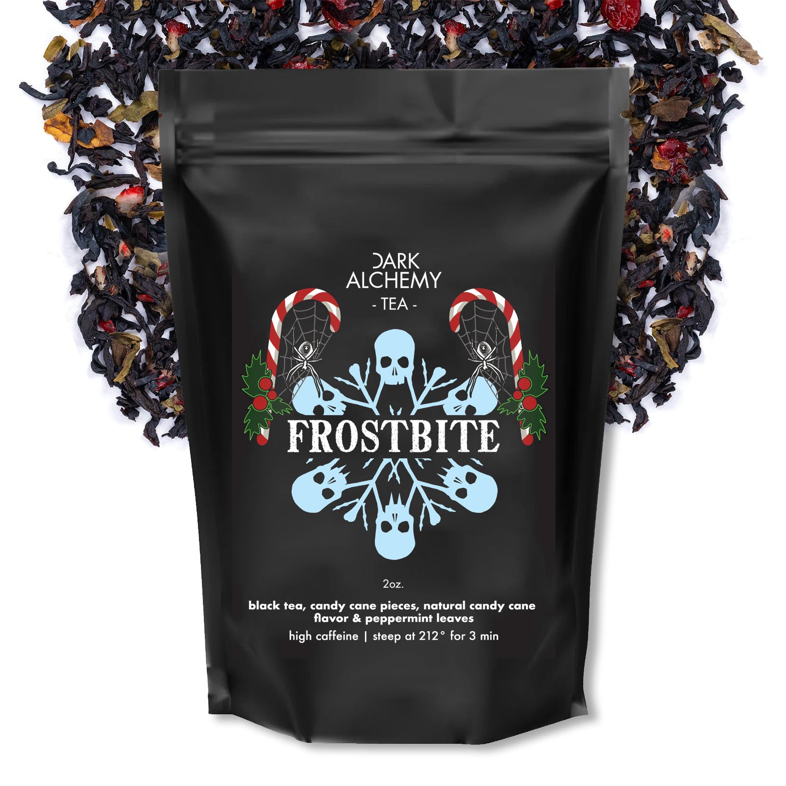 Frostbite Tea hits like a winter kiss that is equal parts refreshing and wickedly cool. It begins with strong, comforting black tea, deep and smooth enough to handle the chill. Then comes the icy spark of peppermint leaves, crisp and clean like a frozen night sky. Real candy cane pieces melt into the brew with sweet, minty charm, while natural candy cane flavor layers on that striking coolness you can actually feel, leaving a tingle on your lips that lingers longer than it should.
