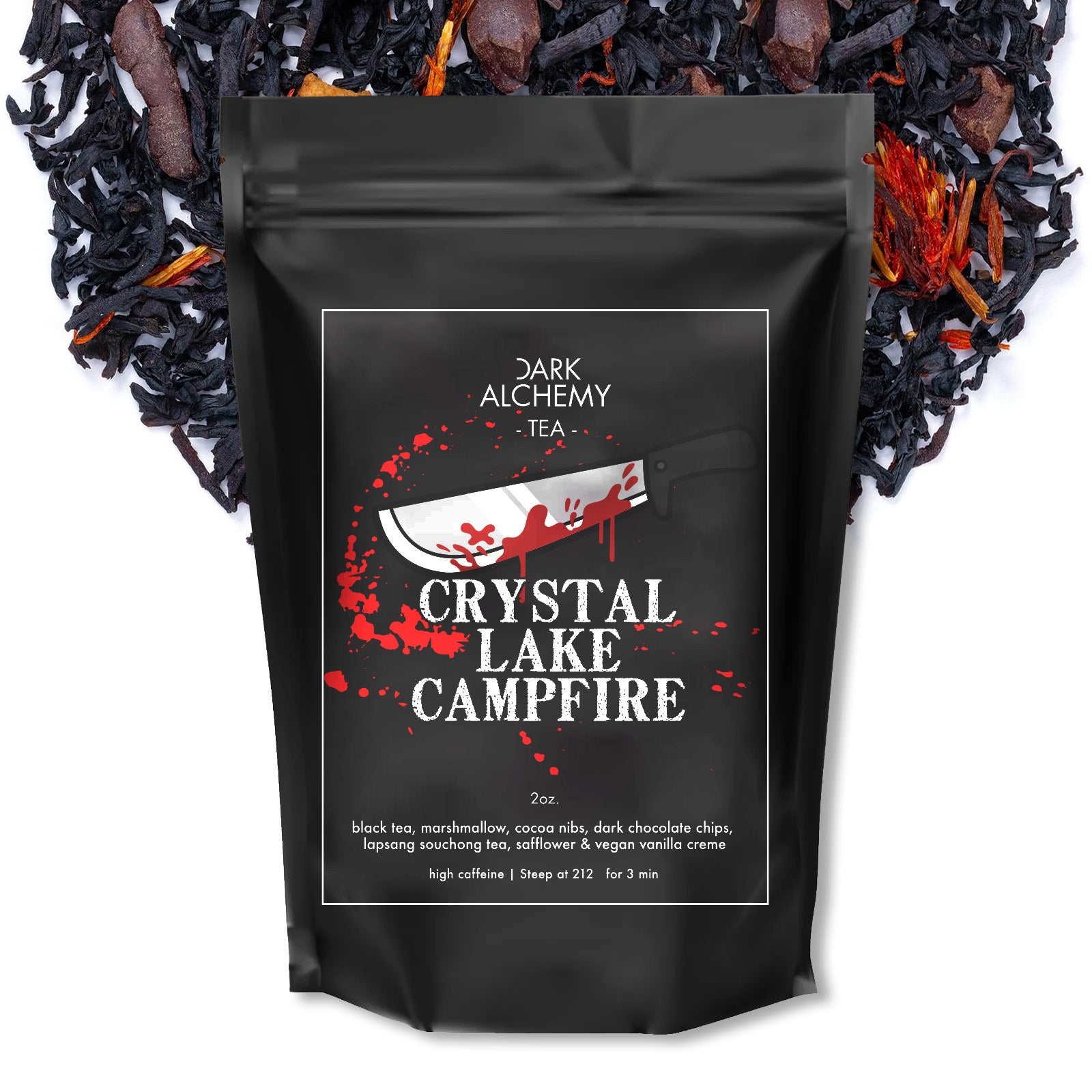 Crystal Lake Campfire is a dark, nostalgic blend inspired by moonlit woods, drifting smoke, and quiet summer nights by the water. Rich black tea and lapsang souchong create a gentle smokiness, layered with cocoa nibs, dark chocolate, and soft marshmallow for a comforting, fireside warmth. Hints of vanilla creme smooth the cup, while subtle sweetness and smoke linger like embers after midnight. Cozy, eerie, and cinematic, this tea is perfect for evenings when the fire is low and the forest feels just a little too still.