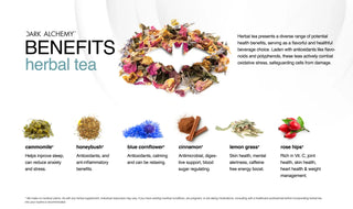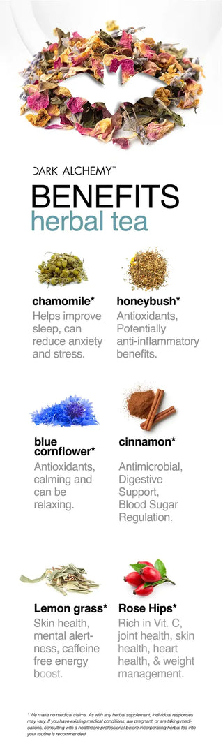 Dark Alchemy Herbal Teas are crafted with care to offer unique benefits for both body and mind. For relaxation, blends featuring chamomile or lavender help you unwind and find calm. Looking to support digestion? Our teas with peppermint or ginger are perfect for soothing the stomach. Need an energy boost? Dark Alchemy’s energizing blends with chocolate or invigorating citrus fruits can give you a natural lift. Every blend is thoughtfully designed to combine bold flavors with wellness benefits, making them the perfect addition to your daily rituals.